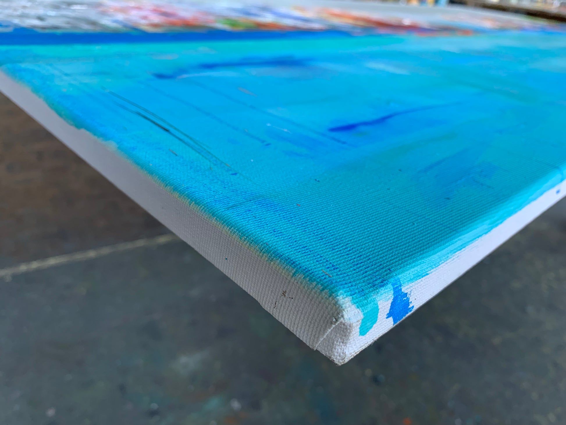 Cool, expansive blues create a sense of openness and distance, while concentrated passages of warmer tones introduce density and a grounded counterbalance. Fine linear interventions suggest underlying structure without fully resolving into form, maintaining a delicate tension between order and fluidity.