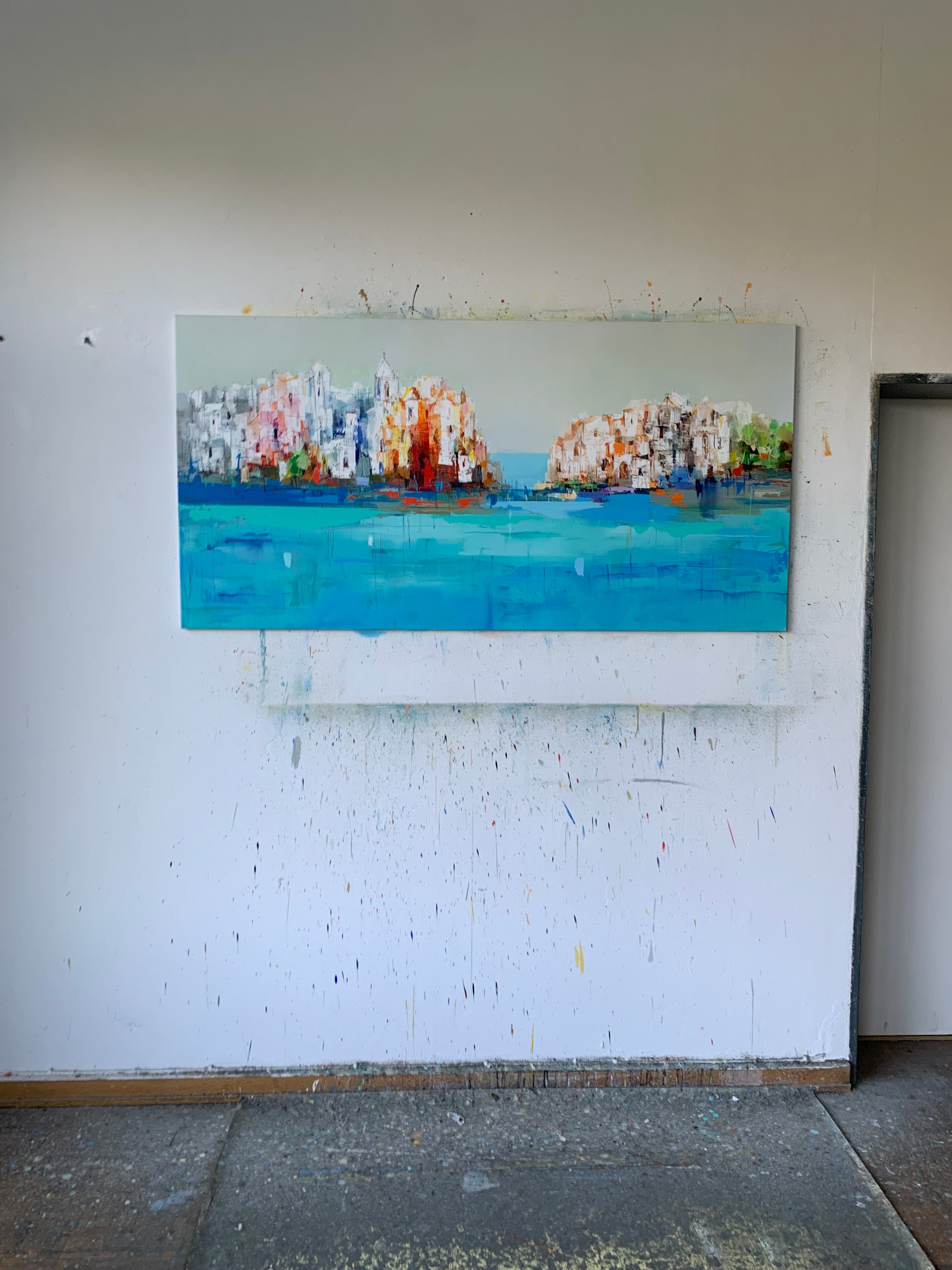 This work is composed through a refined interplay of structure and atmosphere, where abstracted architectural elements emerge within a luminous field of color. The composition is anchored by a subtle horizon, allowing spatial depth to unfold with clarity and restraint.