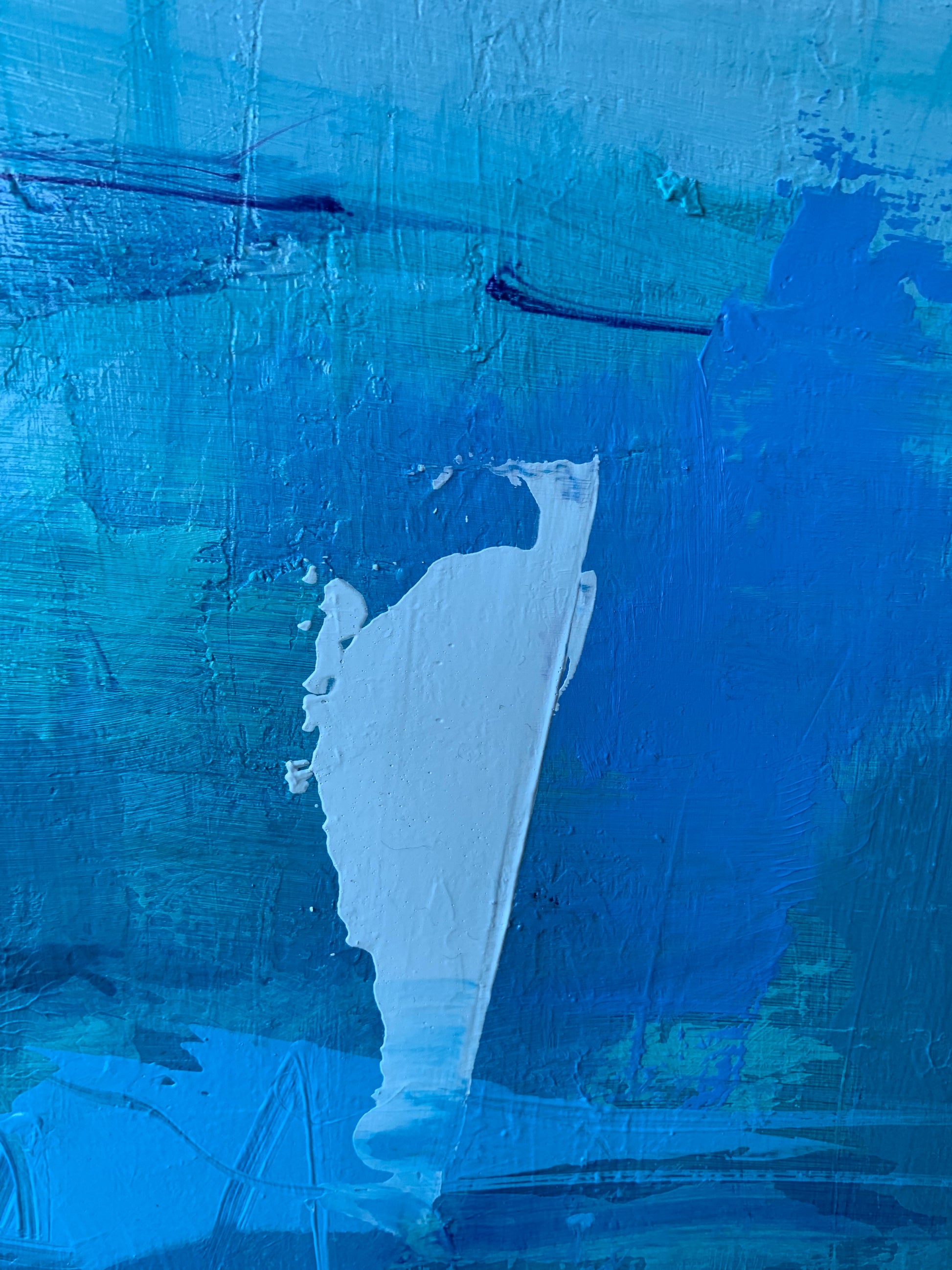 This work unfolds through a layered and intuitive process, where a deep oceanic blue establishes a calm yet expansive field. Within this atmosphere, small yellow accents surface intermittently — subtle interruptions that introduce warmth and quiet tension without disrupting the overall balance.