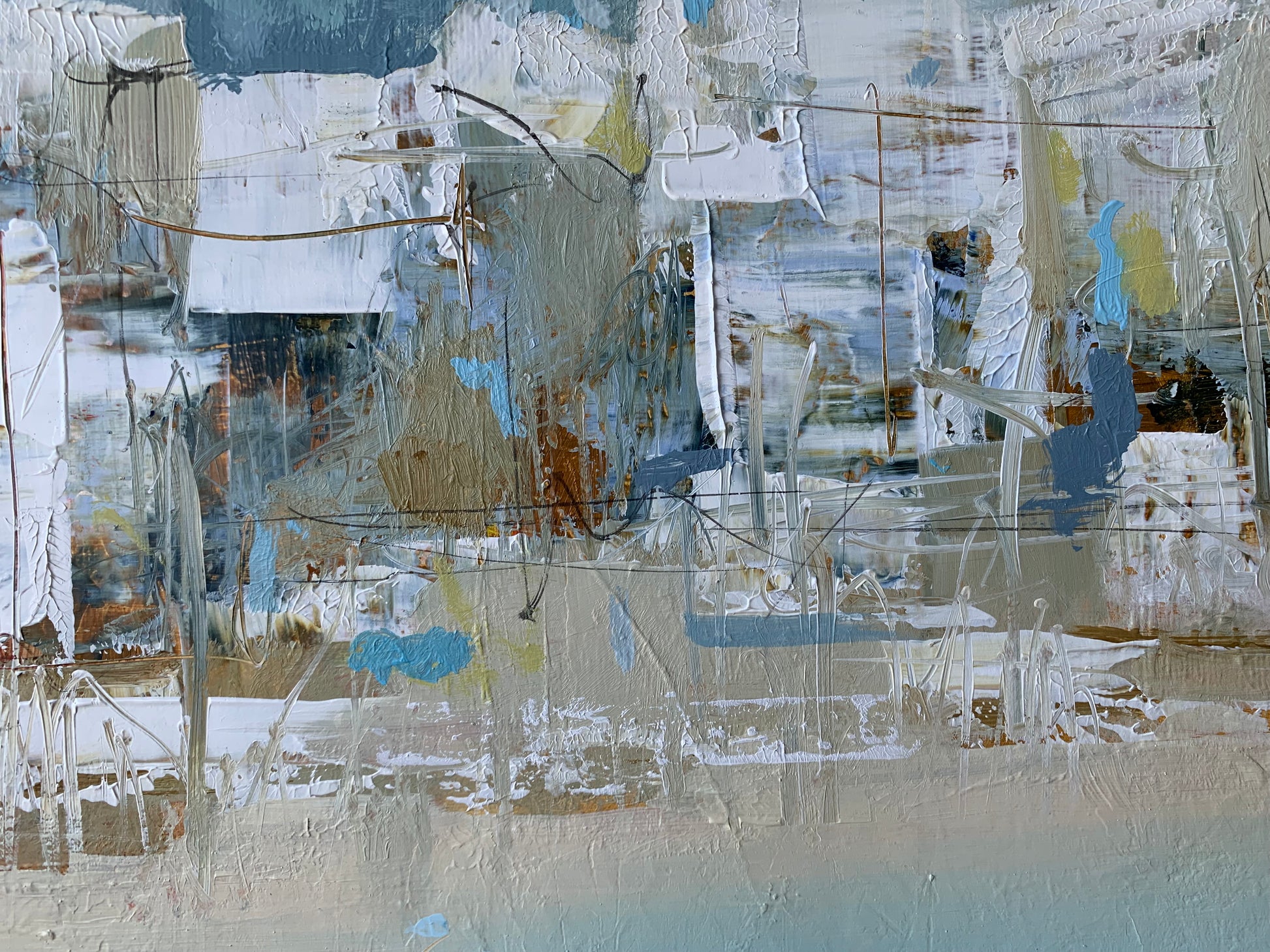 The composition moves between openness and precision, allowing color to carry both structure and nuance. The cooler tonal depth creates spatial breadth, while the restrained yellow elements act as moments of light, guiding the eye without insisting on a fixed focal point.