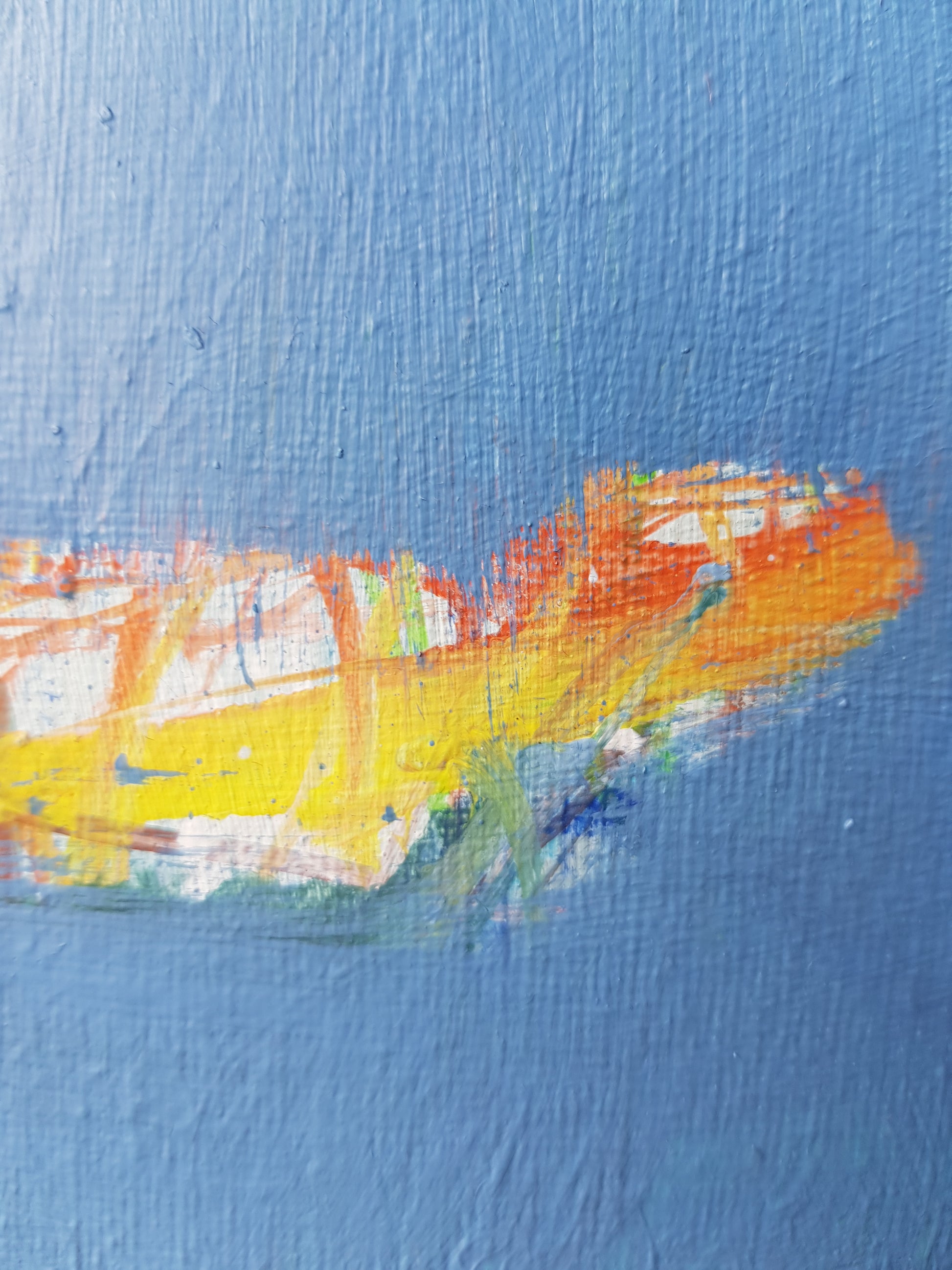 This work is shaped through an intuitive layering of color and gesture, where contrasting elements are brought into a controlled visual dialogue. Broad areas of color establish a sense of structure, while fluid marks and linear traces introduce movement across the surface.